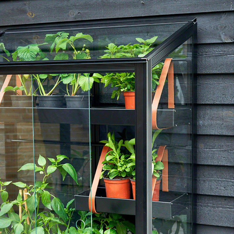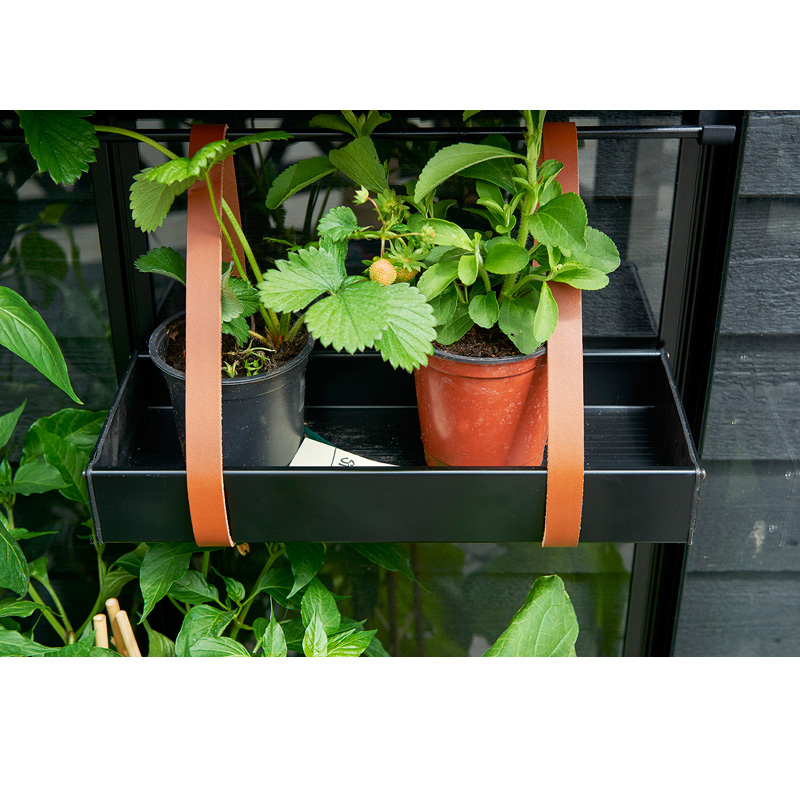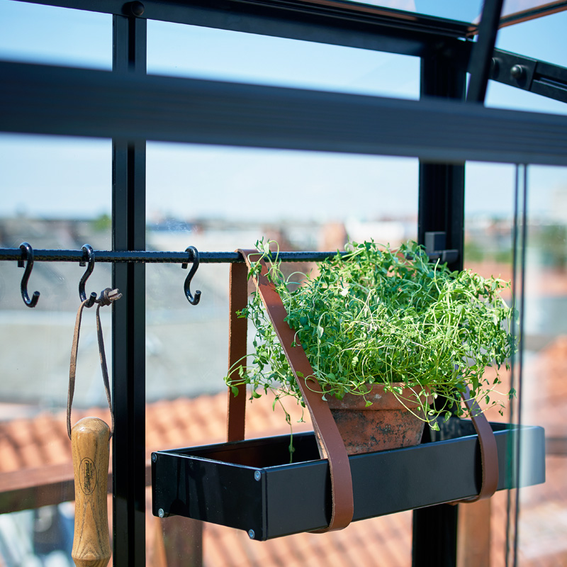 Med i købet følger der både en pæn bund af træ og en skøn hylde med læderstropper, og selve rammen omkring glasset er lavet af sortlakeret aluminium. Det vejer ikke meget, og er meget nemt at flytte rundt på, hvis du står og mangler den smule plads, som det lille drivhus optager.