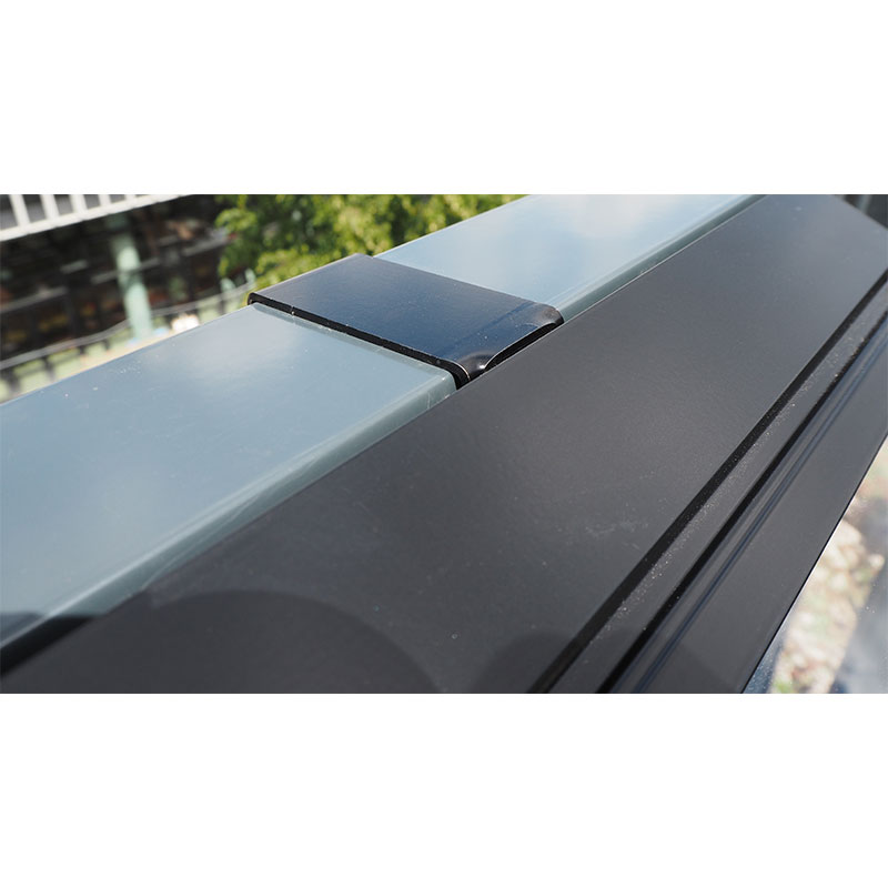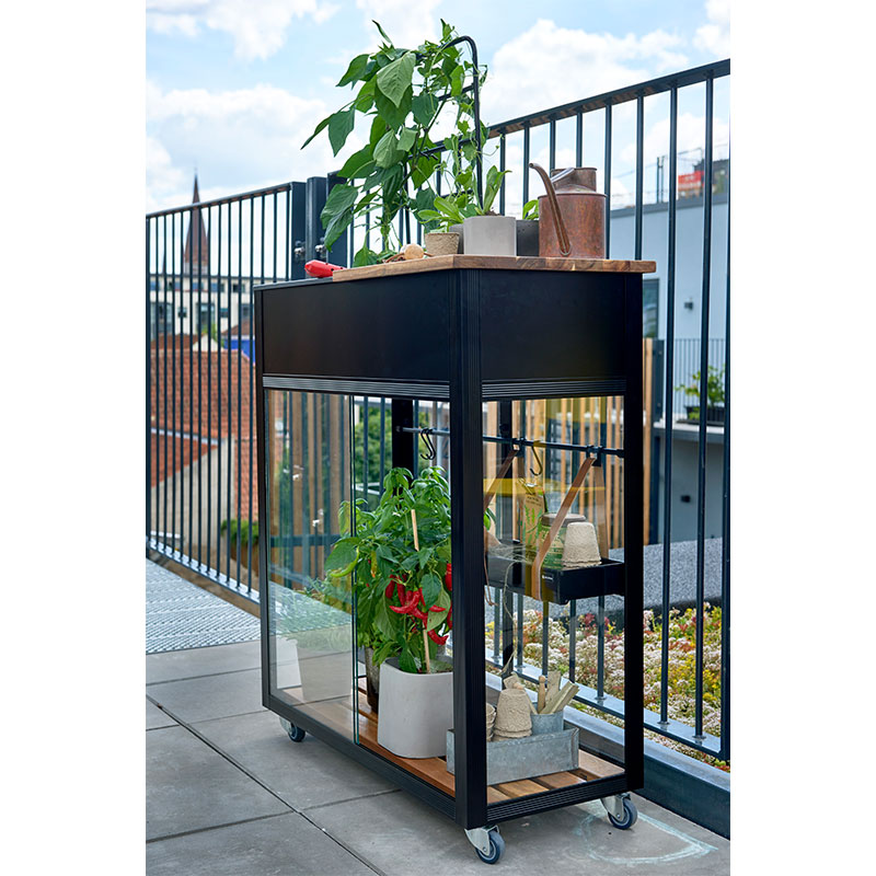 Designet er ret moderne, og rammen består af sortlakeret aluminium med 4 mm hærdet glas. Indvendigt finder du en hylde du kan tage ud, og hvori du kan undervande – så er det nemlig meget nemmere at holde gang i krydderurterne. Der er skydelåger i, så du altid nemt kan tilgå og pleje dine krydderurter.