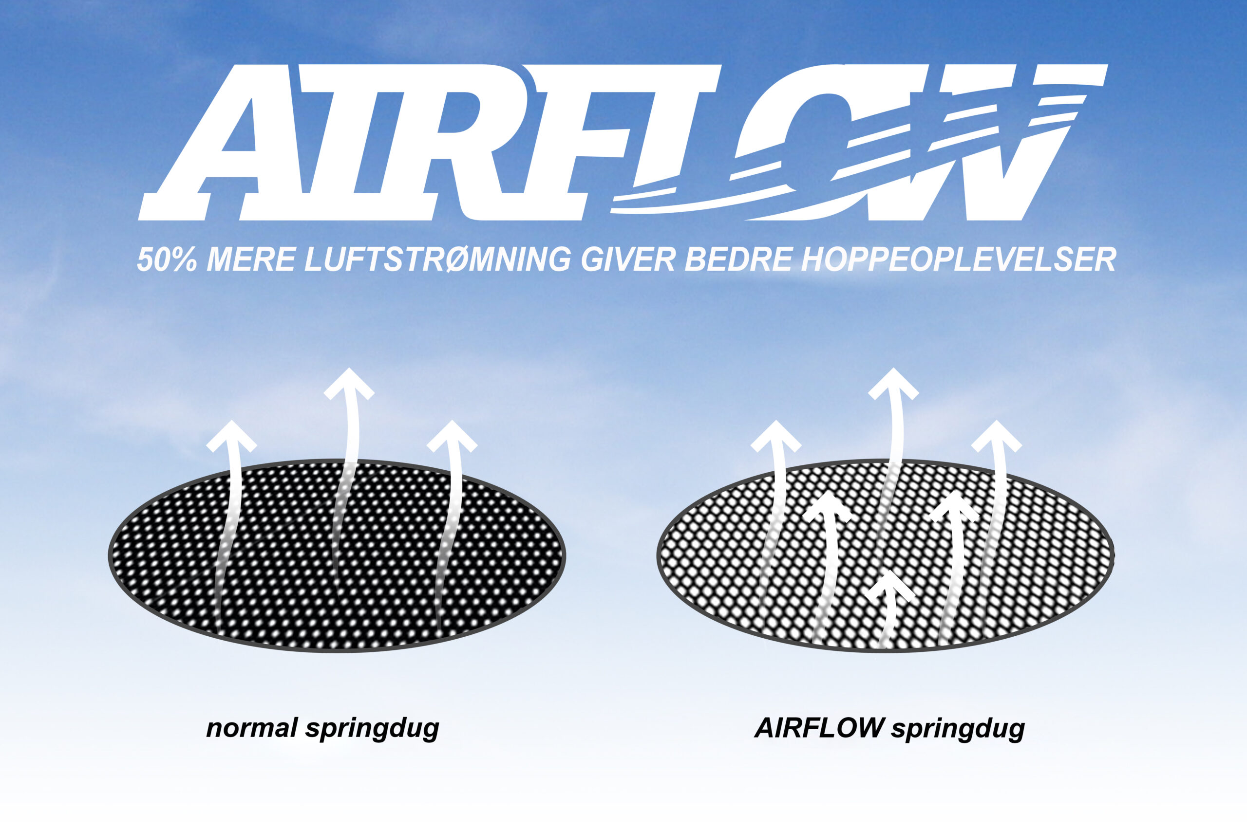 Dugen, som man hopper på, er ret speciel. Det er en AirFlow Springdug, som øger lufttilstrømningen med ca. 50%, og det hjælper til at øge springkraften. Så ikke nok med at den er super sikker, så er den også både holdbar og super fed at hoppe på grundet både fjedrene og springdugen.