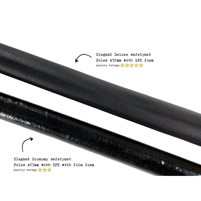 Kanten omkring trampolinen er polstret med og forsynet med net, hvilket også hjælper til øget sikkerhed når man hopper, og man undgår at slå sig, når man lander på kanterne grundet den tykke beskyttelsespolstring.